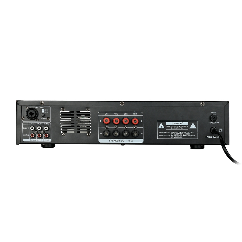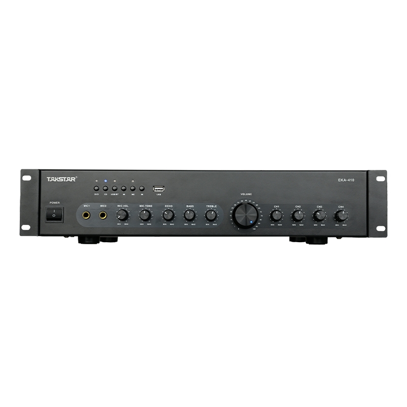 Takstar EKA-410 là bộ amply nguyên khối (integrated amplifier) với 4 kênh công suất cố định, mỗi kênh cho ra 100 W (ở 8 Ω), phù hợp cho hệ thống âm thanh đa vùng hoặc nhiều loa cùng lúc. Thiết bị có vỏ kim loại chắc chắn, biến áp chất lượng cao, giúp hoạt động ổn định và bền bỉ trong yêu cầu chuyên nghiệp.