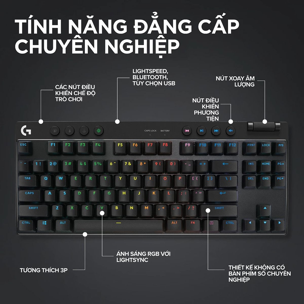 Tóm lại: Logitech Pro X TKL Lightspeed là sự kết hợp hoàn hảo giữa sự nhỏ gọn của dòng TKL và công nghệ không dây đầu ngành. Với chất liệu phím bền bỉ (PBT Doubleshot), kết nối đa dạng (Lightspeed + Bluetooth) và thời lượng pin tốt, đây là công cụ hỗ trợ đắc lực cho mọi game thủ muốn nâng cấp setup