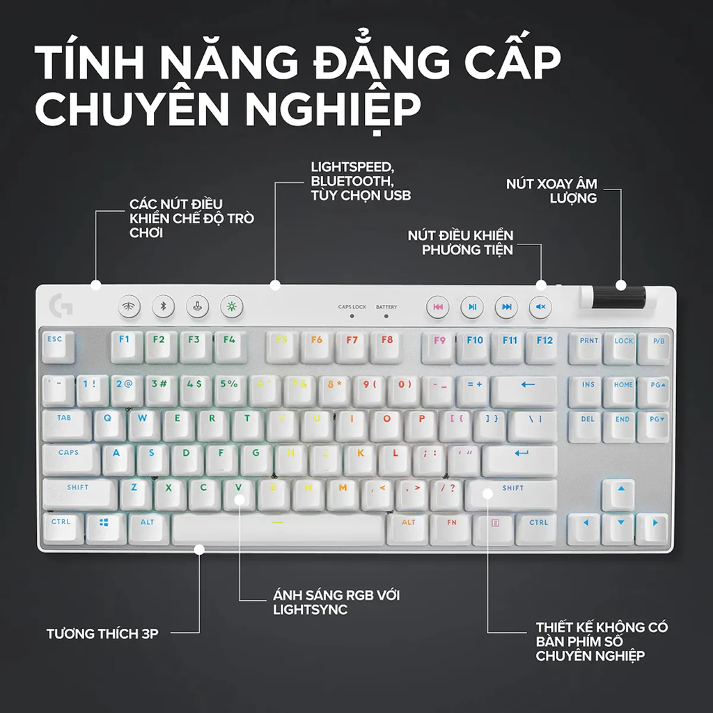 Tóm lại: Logitech Pro X TKL Lightspeed là sự kết hợp hoàn hảo giữa sự nhỏ gọn của dòng TKL và công nghệ không dây đầu ngành. Với chất liệu phím bền bỉ (PBT Doubleshot), kết nối đa dạng (Lightspeed + Bluetooth) và thời lượng pin tốt, đây là công cụ hỗ trợ đắc lực cho mọi game thủ muốn nâng cấp setup
