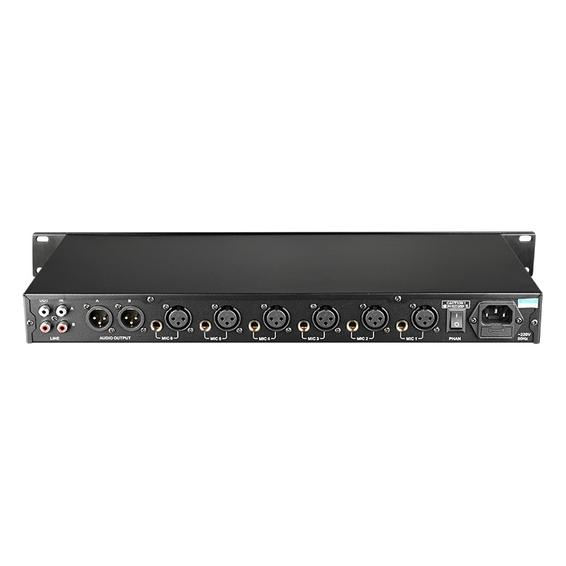 Output: 2 × XLR (master output), cùng với đầu ra line RCA kép cho hệ thống âm thanh hoặc ampli trung tâm.