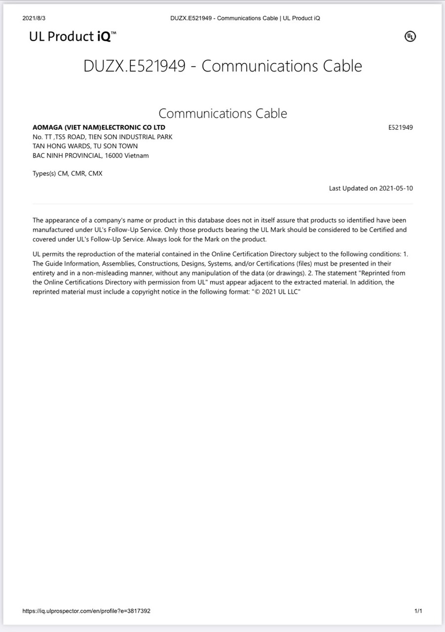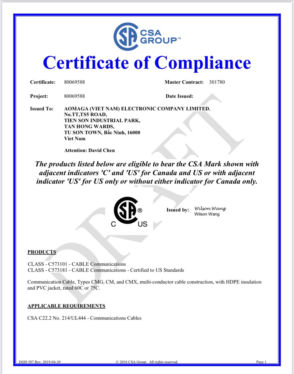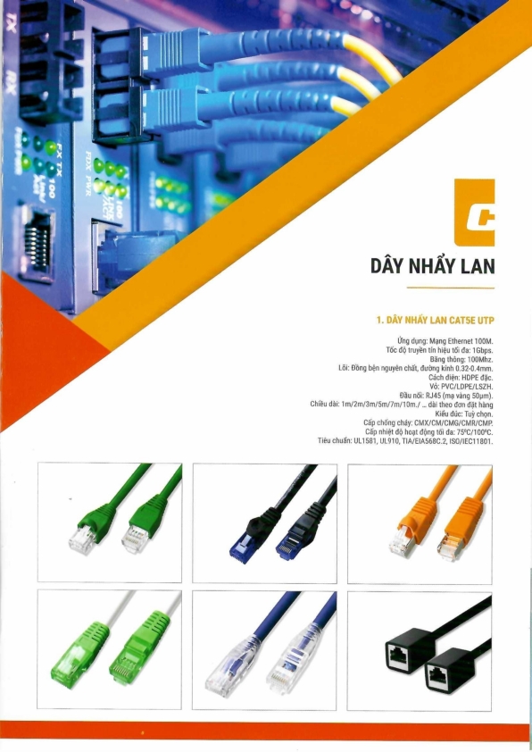 Tiêu chuẩn : UL1581, UL910, TIA, EIA568C.2, ISO / IEC11801