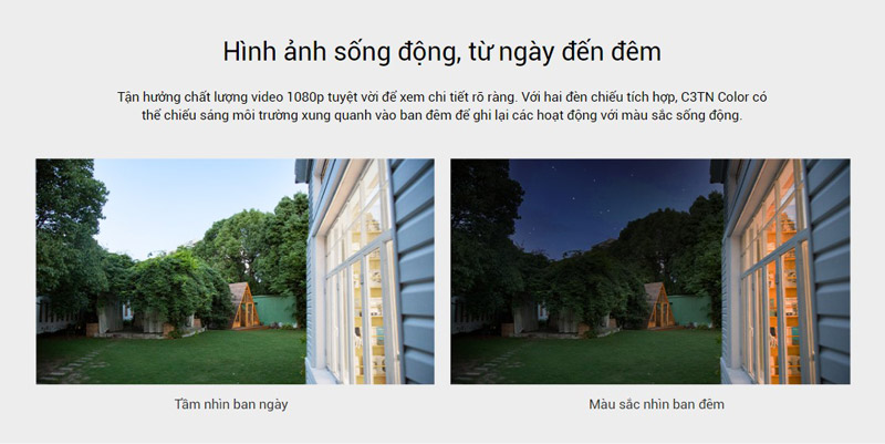 Tận hưởng chất lượng video 1080p tuyệt vời để xem chi tiết rõ ràng. Với hai đèn chiếu tích hợp, C3TN Color có thể chiếu sáng môi trường xung quanh vào ban đêm để ghi lại các hoạt động với màu sắc sống động.