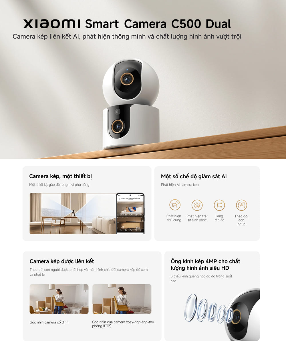 Camera thông minh Xiaomi C500 Dual EU (BHR8755EU) là thiết bị giám sát hiện đại với độ phân giải 2560 x 1440p sắc nét, hỗ trợ mã hóa video H.265 tiết kiệm băng thông. Thiết bị kết nối không dây đa dạng qua Wi-Fi 2.4/5 GHz chuẩn IEEE 802.11 a/b/g/n/ac/ax và Bluetooth 5.3, tương thích với Android 8.0 trở lên và iOS 12.0 trở lên. Camera phù hợp cho nhu cầu giám sát an ninh chuyên nghiệp với nhiều phương thức lưu trữ đa dạng.