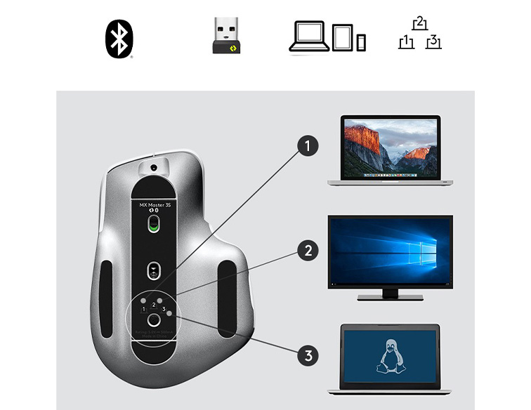 Con chuột máy tính của bạn ghép cặp ngay lập tức với tối đa ba thiết bị thông qua Bluetooth, Wireless hoặc Đầu thu USB Logi Bolt đi kèm.