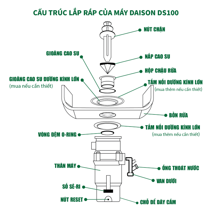| Tính năng nổi bật | Tự khởi động lại khi quá tải, giảm mùi, tiết kiệm chi phí vệ sinh bồn rửa |