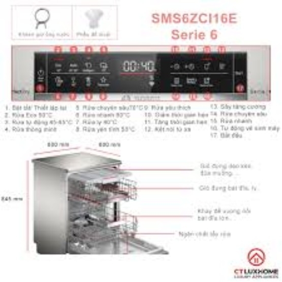 Bosch SMS6ZCI16E là mẫu máy rửa chén độc lập kích thước 60 cm, thuộc Series 6, nhập khẩu Đức. Máy thiết kế bề mặt inox chống vân tay tinh tế, phù hợp cho gia đình 4–6 người với dung tích 14 bộ chén tiêu chuẩn EU .