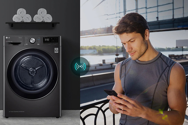 Máy sấy LG DVHP09B hỗ trợ kết nối với smartphone thông qua ứng dụng LG ThinQ™, cho phép người dùng điều khiển và theo dõi trạng thái máy mọi lúc, mọi nơi.