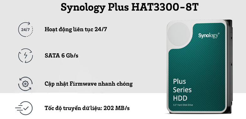 Synology Plus HAT3300 8T là mẫu ổ cứng HDD hiệu năng cao được Synology sản xuất, đáp ứng các nhu cầu về lưu trữ dữ liệu của người dùng cá nhân, gia đình và các doanh nghiệp vừa - nhỏ. Synology Plus 8T cung cấp 8 TB dung lượng lưu trữ khả dụng, hỗ trợ tốc độ truyền tải dữ liệu lên tới 6Gbps với chuẩn SATA III. Nếu bạn đọc đang tìm kiếm các mẫu sản phẩm ổ cứng cho thiết bị lưu trữ Nas, chắc chắn sẽ không thể bỏ qua bài viết ngay sau đây!