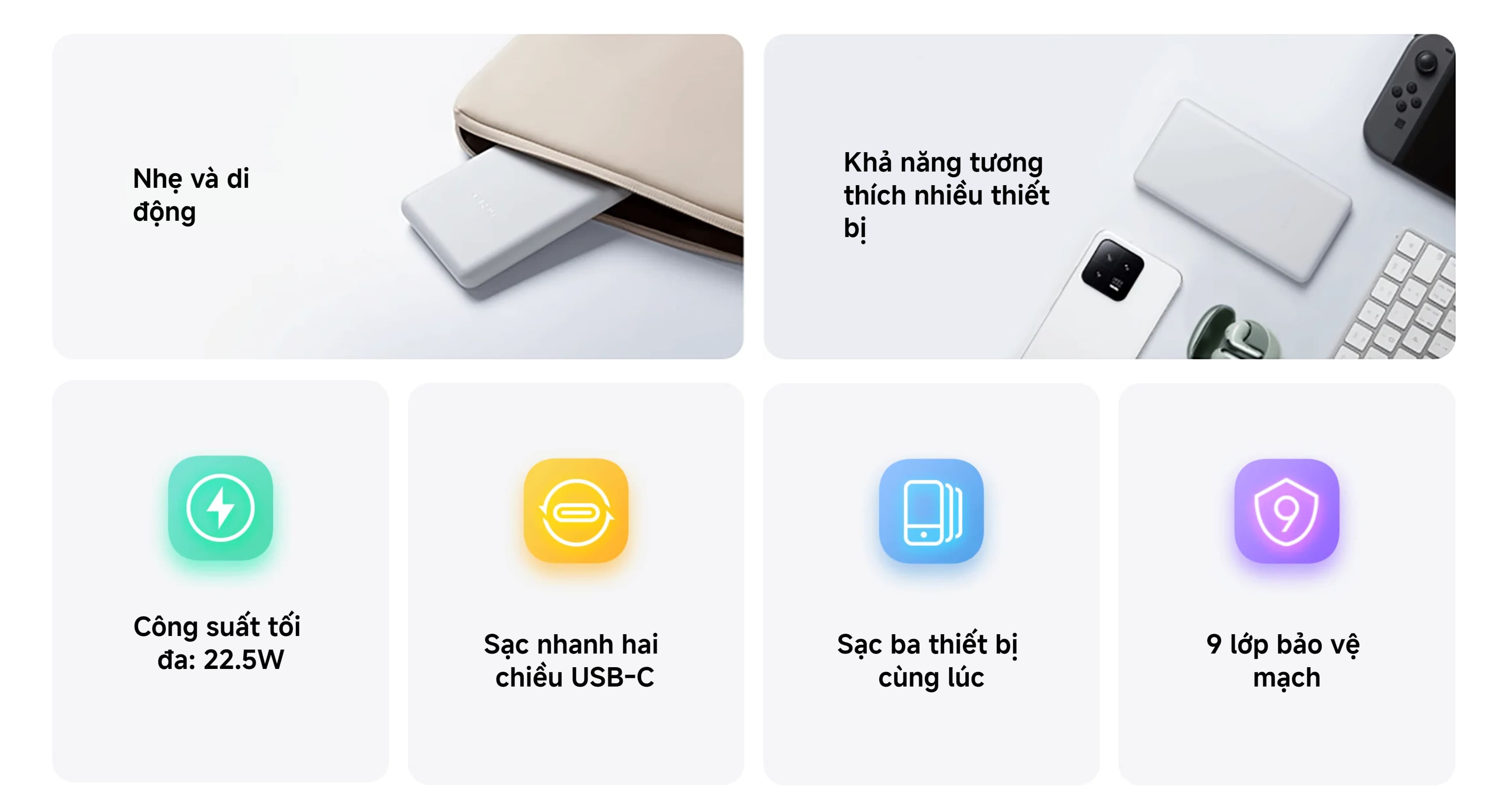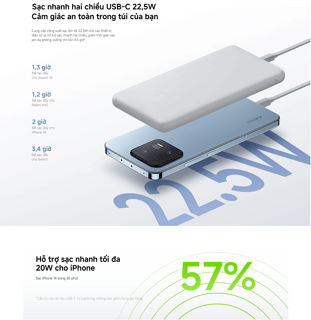• Công suất sạc nhanh 22.5W hỗ trợ cả USB-A và USB-C