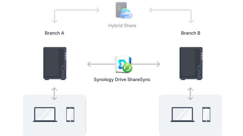 Đối với các doanh nghiệp đa chi nhánh, tính năng Synology Drive ShareSync sẽ cho phép đồng bộ dữ liệu giữa nhiều thiết bị NAS thuộc các chi nhánh khác nhau của doanh nghiệp. Đồng thời, quản trị viên của từng hệ thống có thể thiết lập cấu hình để tự động đồng bộ tập tin riêng lẻ hoặc thư mục dữ liệu được chia sẻ hỗ trợ cải thiện hiệu suất công việc, chia sẻ dữ liệu giữa các chi nhánh trong công ty.