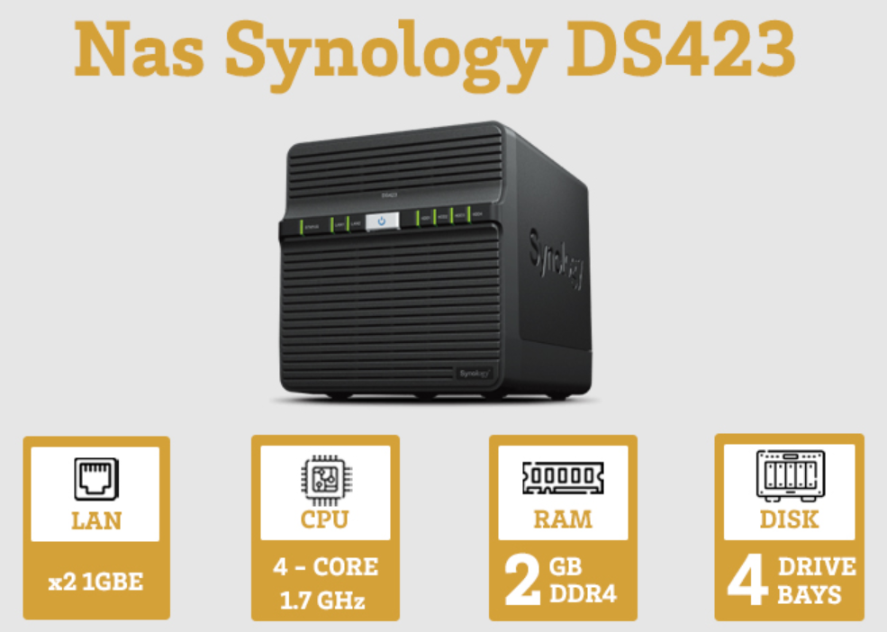 DiskStation DS423 là một thiết bị lưu trữ mạng (Nas)được thiết kế và sản xuất bởi Synology, một trong những nhà cung cấp hàng đầu trong lĩnh vực lưu trữ dữ liệu đám mây và giải pháp bảo mật. Với một số tính năng đáng chú ý, DiskStation DS423 là một nền tảng quản lý dữ liệu đa năng dành cho các công việc văn phòng, nhưng cũng phù hợp cho các nhu cầu cá nhân.