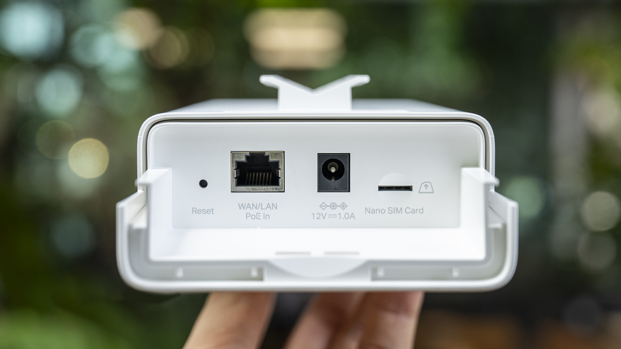 Cụm cổng kết nối được bố trí gọn gàng ở đáy TP-Link TL-MR100 Outdoor, ẩn sau một nắp trượt có ron cao su chống nước. Bên trong gồm: